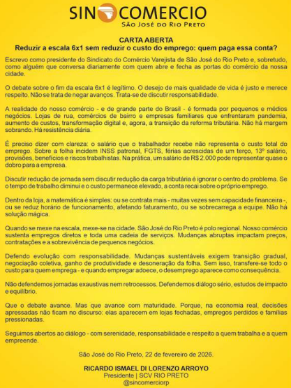 O debate sobre a escala 6×1 precisa ser feito com maturidade. Não se trata de ser contra avanços. Trata-se de discutir quem paga a conta quando o custo do emprego continua alto. Nosso comércio é formado, majoritariamente, por pequenos e médios negócios. Mudanças estruturais precisam vir acompanhadas de responsabilidade fiscal e diálogo.