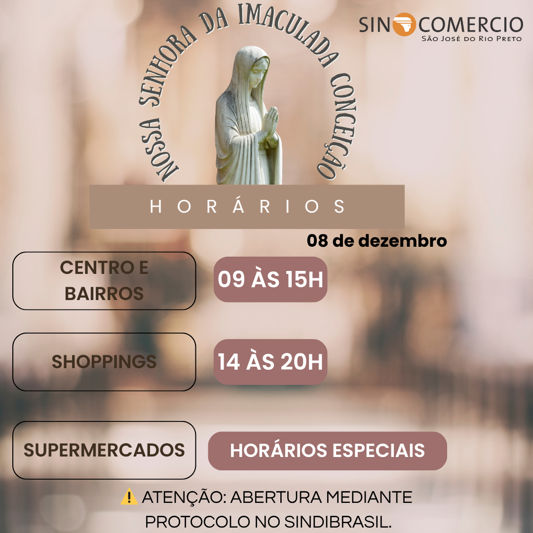 📌 Horários de funcionamento:🏬 Centro e bairros: 09h às 15h🛍️ Shoppings: 12h às 20h🛒 Supermercados: horários especiais ⚠️ Lembrando que a abertura no feriado só é permitida mediante protocolo no Sindibrasil.