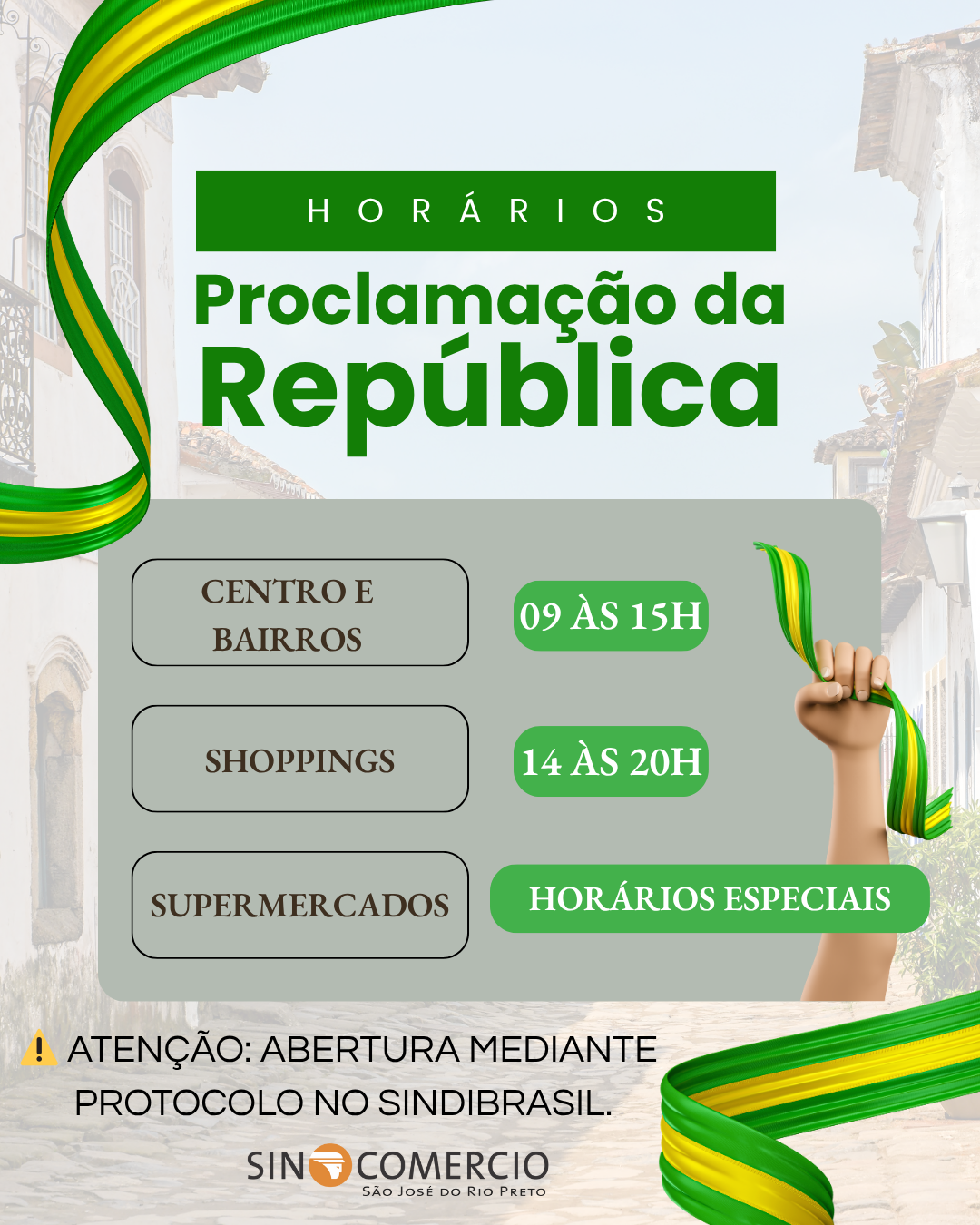 🛍️ Comércio de rua: das 9h às 15h🏬 Shoppings: das 14h às 20h🛒 Supermercados: horários especiais🔒 É OBRIGATÓRIO protocolar a adesão no site do SindiBrasil! ⚠️NÃO DEIXE PRA ÚLTIMA HORA!Site: SindiBrasil, faça o protocolo e atue dentro da legalidade.Siga o Sincomercio Rio Preto: Facebook: https://www.facebook.com/SincomercioRioPretoInstagram: https://www.instagram.com/sincomerciorp/